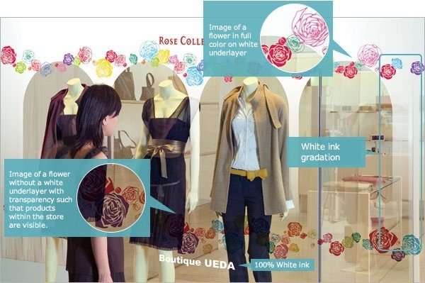 Simultaneous layer printing is very effective on transparent media; color printing on white underlayers gives a more vivid impression. In addition, the combination of full color ink with silver ink allows a more vibrant expression of the metallic colors such as gold, silver, and bronze.